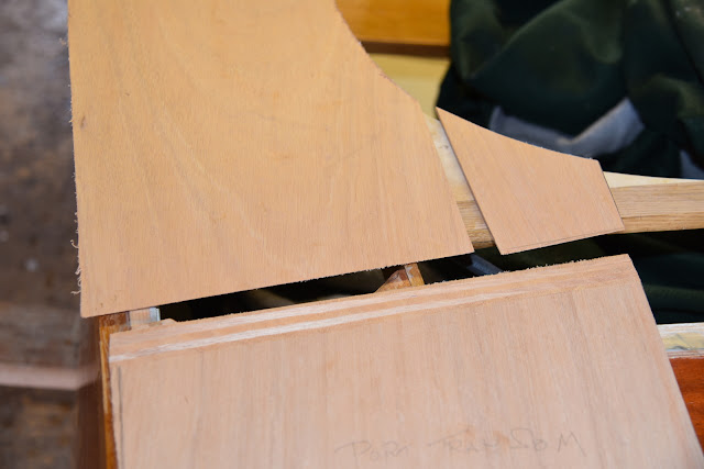 Decking now complete apart from rounding off the deck edges. A light coloured wood to show off the lines to best advantage is being sourced. Sycamore the first choice if I can find some straight grained and clean. The tinted grey acrylic windscreen has been ordered from a local plastics company and will be made to slot into support knees and a scuttle batten laid on the deck.